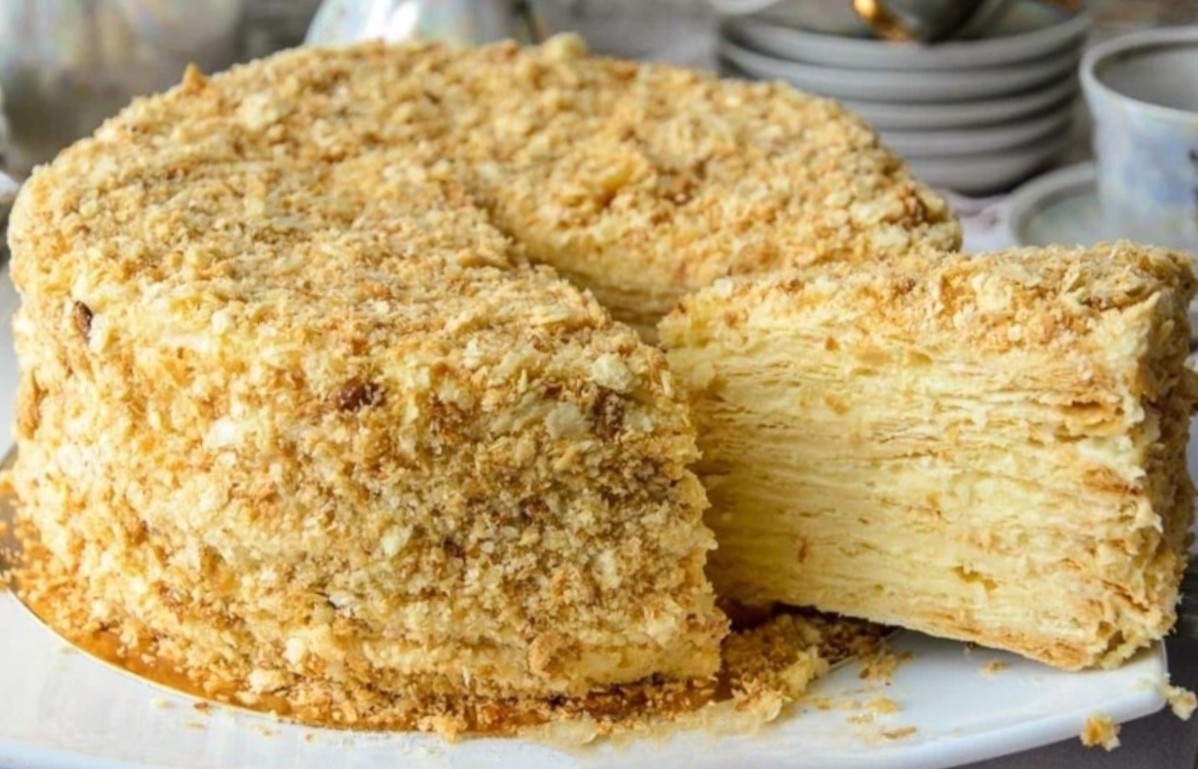Каждый корж раскатываю вручную, очень тонко, почти прозрачно, и выпекаю по одному, наблюдая, как они постепенно становятся золотистыми и хрустящими. Не использую готовые смеси и не ускоряю процесс — Наполеон этого не прощает. Заварной крем варю на натуральном молоке с желтками, добавляя сахар и ваниль, и довожу до той самой консистенции, когда он уже густой, но ещё живой.