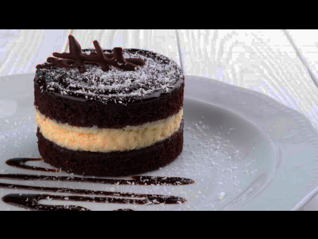 Готовый корж достаю из духовки, освобождаю из формы и полностью остужаю. Разрезаю его пополам. Нижний корж смазываю половиной застывшего крема, выравниваю верх и бока. Накрываю вторым коржом и покрываю оставшимся кремом, снова аккуратно разравнивая поверхность.