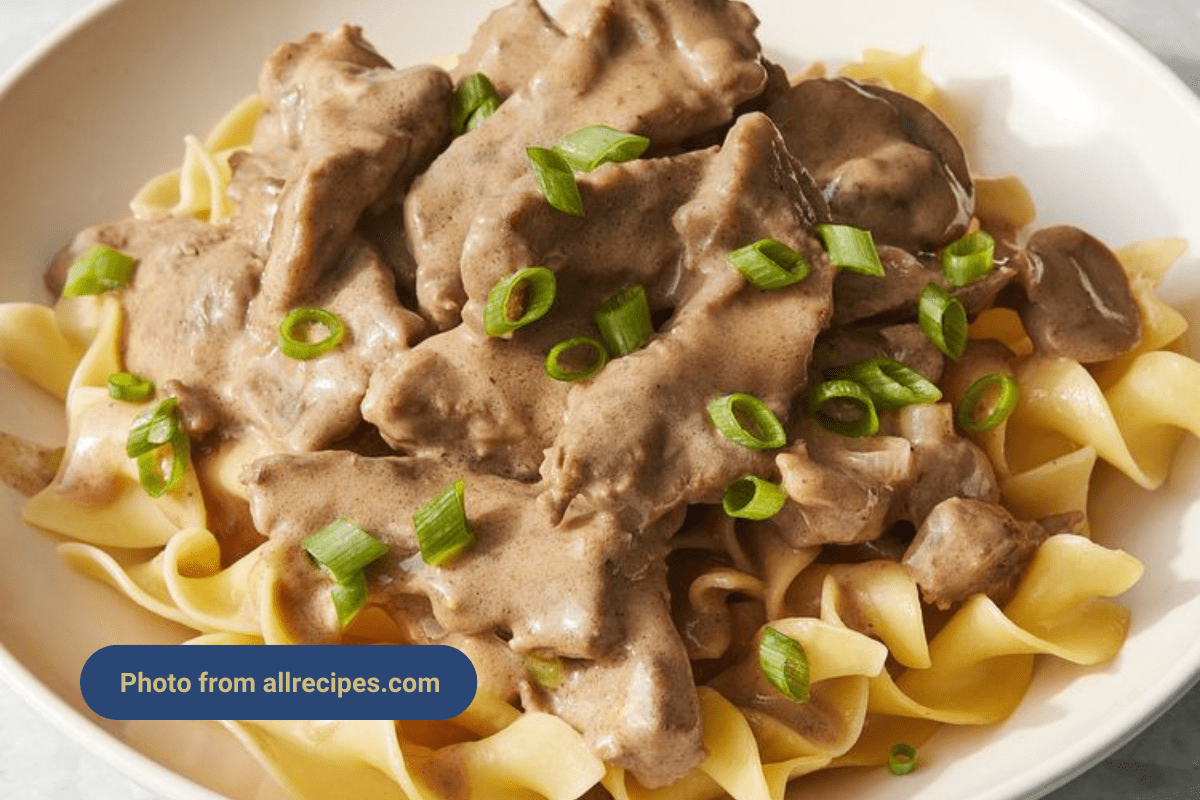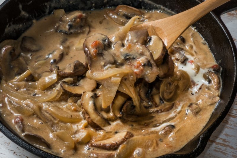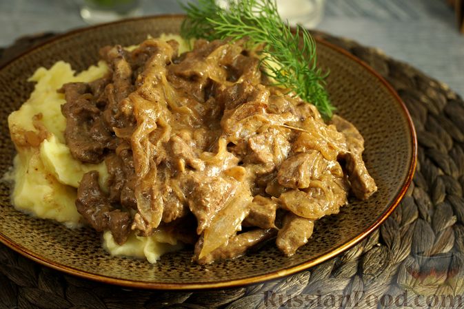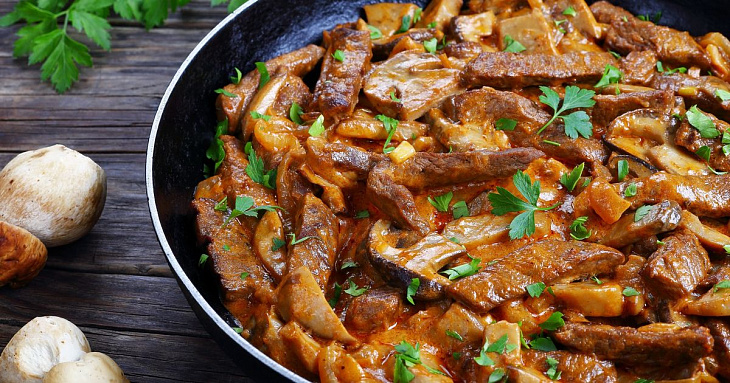 Классический бефстроганов: нежная говядина в сливочном соусе с грибами