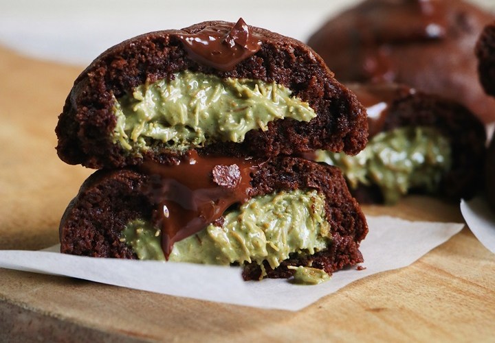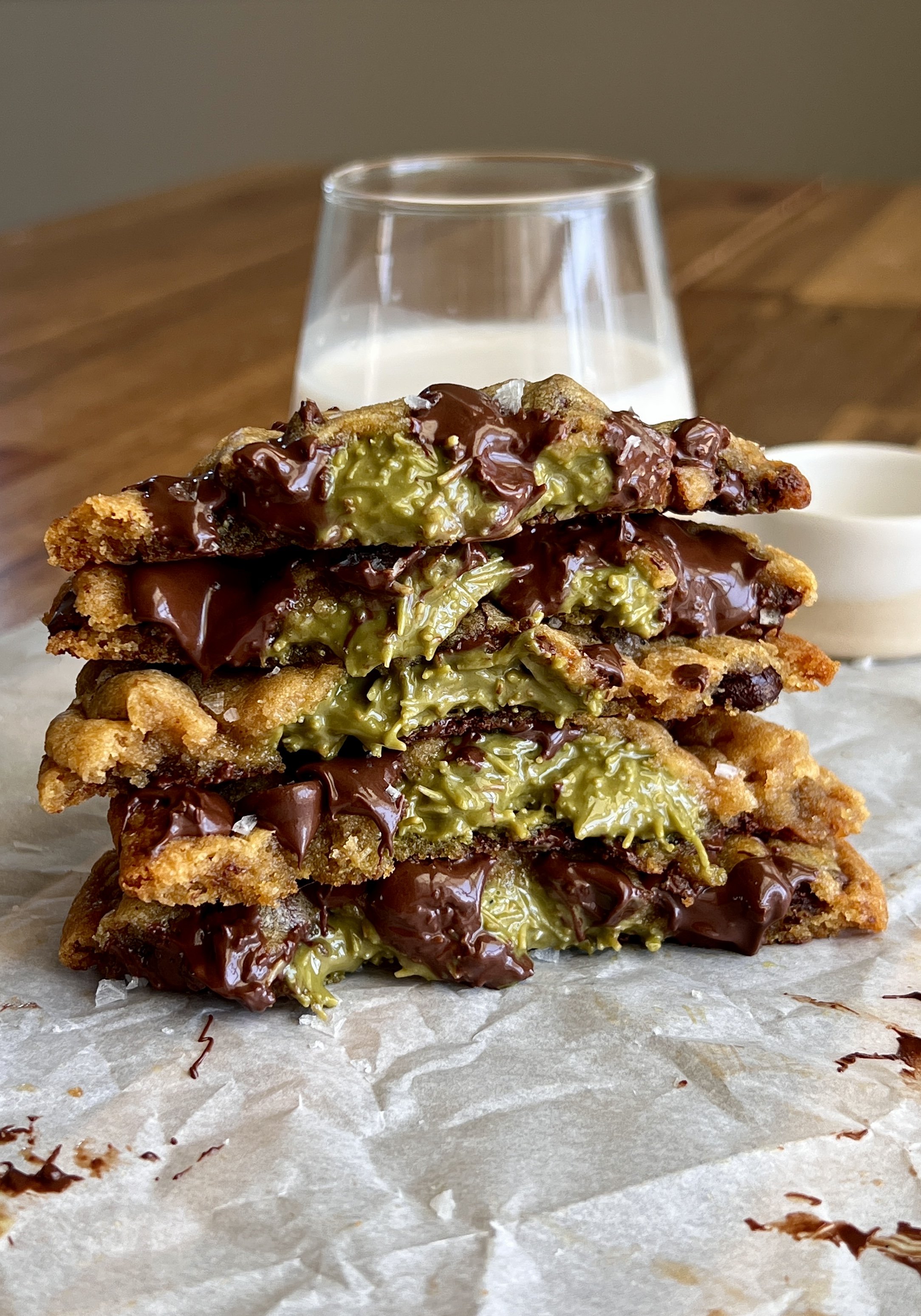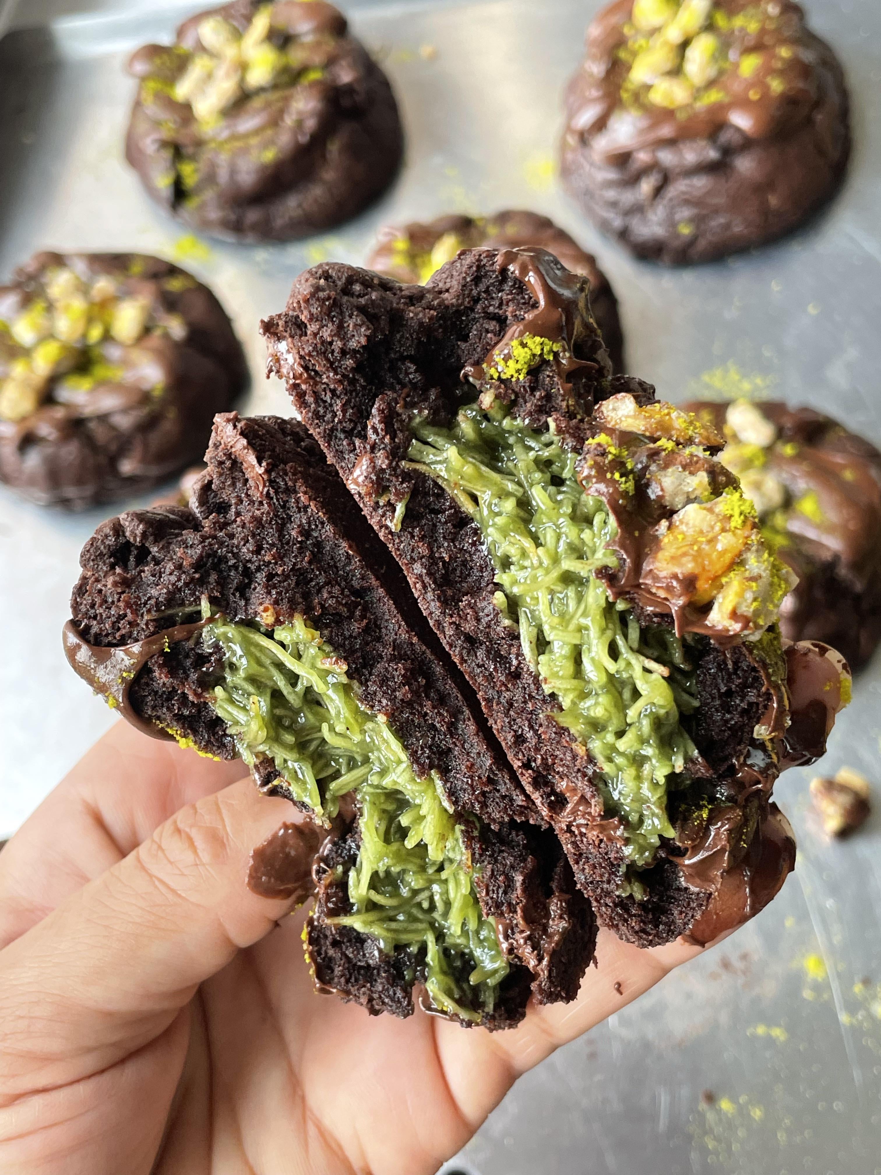 Это печенье сочетает насыщенный шоколадный вкус, мягкую жевательную текстуру, кремовую фисташковую начинку в центре и кусочки растопленного шоколада. Рецепт вдохновлен популярным дубайским шоколадным батончиком, но готовится из доступных продуктов.